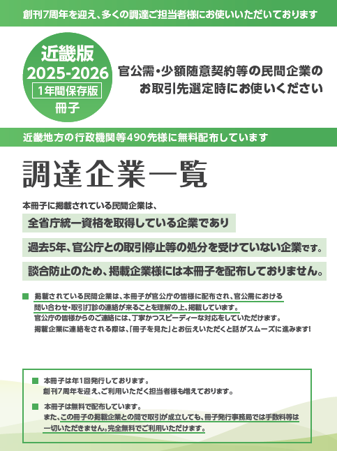 弊社は、官公庁・自治体の調達先企業として信頼性を認められ、近畿版「調達企業一覧(2025-2026)」に掲載されました。