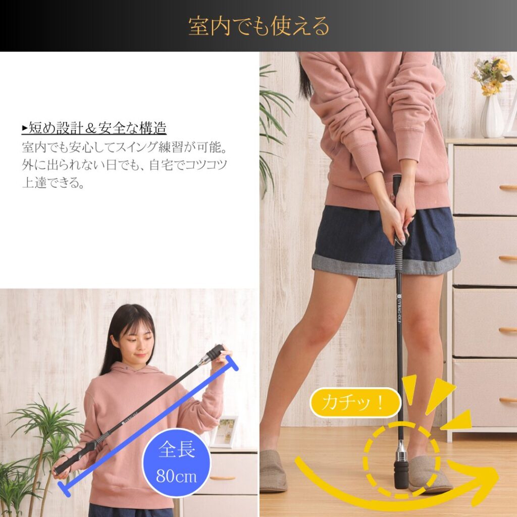 短め設計&安全構造だから、室内でもしっかりスイング。