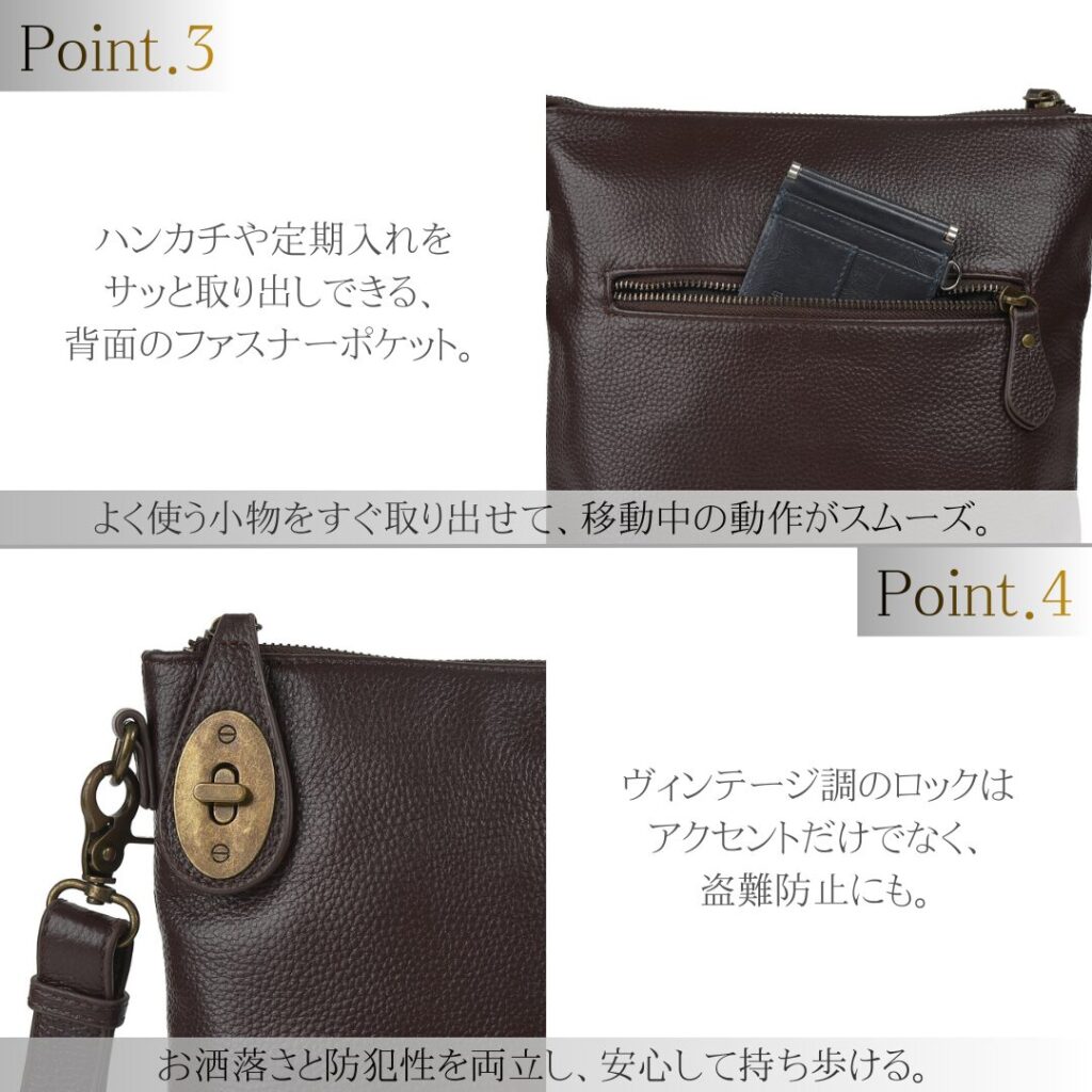ファスナーロックで防犯性も高まり、人混みでも安心。